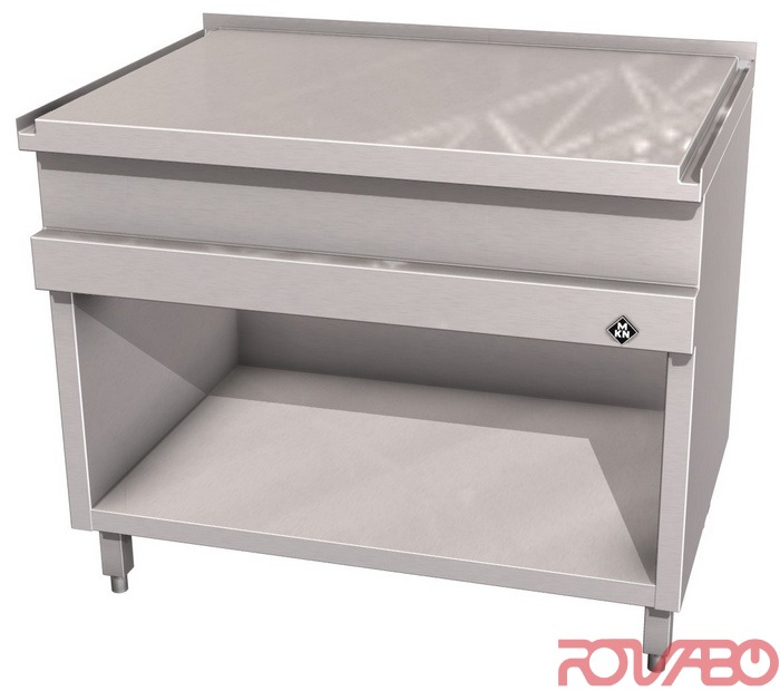 Верхняя и опорная часть рамной конструкции или с блоком выдвижных ящиков (по запросу). Корпус полностью из хромоникелевой стали (1.4301) / (AISI 304). Плотно приваренная верхняя поверхность с поперечными дренажными канавками для упрощения очистки. Принадлежности по запросу: съёмные ножки к аппарату высотой 200 мм, регулируемые по высоте на +/– 15 мм (4 шт.).