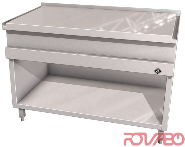 Верхняя и опорная часть рамной конструкции или с блоком выдвижных ящиков (по запросу). Корпус полностью из хромоникелевой стали (1.4301) / (AISI 304). Плотно приваренная верхняя поверхность с поперечными дренажными канавками для упрощения очистки. Принадлежности по запросу: съёмные ножки к аппарату высотой 200 мм, регулируемые по высоте на +/– 15 мм (4 шт.).