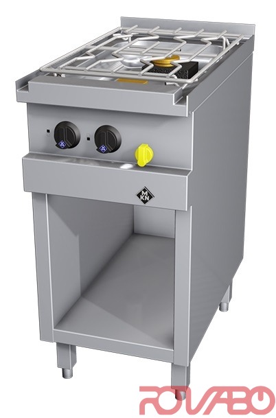 Литые стальные конфорки (h70 мм - предупреждение подгорания выкипающего содержимого) атмосферного типа; термоэлектрическая защита; запальная горелка; ручной поджиг; многопозиционный переключатель, газовый запорный кран. Конфорка на 3,5 кВт (впереди) - тип С, на 5,6 кВт - тип D (сзади). Кран для подключения газа DN20 (¾") вмонтирован в лицевую панель. Газ: природный/жидкий (20; 25/30; 37; 50 мбар). Испытано Немецкой научно-технической ассоциацией газо-и водоснабжения DVGW. На открытом шкафичке. 1 выдвижная решётка из хромоникелевой стали (370x550 мм).