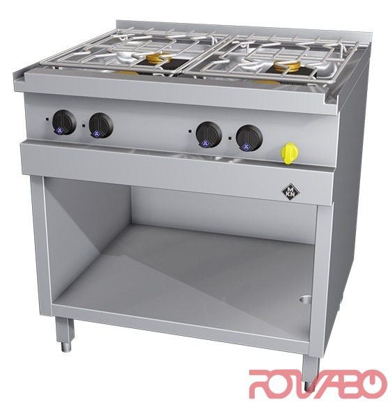 Литые стальные конфорки (h70 мм - предупреждение подгорания выкипающего содержимого) атмосферного типа; термоэлектрическая защита; запальная горелка; ручной поджиг; многопозиционный переключатель, газовый запорный кран. 2 конфорки на 3,5 кВт (сзади) - тип С, 2 на 5,6 кВт - тип D (впереди). Кран для подключения газа DN20 (¾") вмонтирован в лицевую панель. Газ: природный/жидкий (20; 25 / 30; 37; 50 мбар). Испытано Немецкой научно-технической ассоциацией газо-и водоснабжения DVGW. На открытом шкафичке. 2 выдвижные решётки из хромоникелевой стали (370x550 мм).