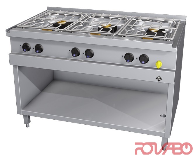 Литые стальные конфорки (h70 мм - предупреждение подгорания выкипающего содержимого) атмосферного типа; термоэлектрическая защита; запальная горелка; ручной поджиг; многопозиционный переключатель, газовый запорный кран. 4 конфорки на 3,5 кВт - тип С, 2 на 5,6 кВт - тип D (впереди слева, впереди по центру). Кран для подключения газа DN20 (¾") вмонтирован в лицевую панель. Газ: природный/жидкий (20; 25 / 30; 37; 50 мбар). Испытано Немецкой научно-технической ассоциацией газо-и водоснабжения DVGW. На открытом шкафичке. 3 выдвижные решётки из хромоникелевой стали (370x550 мм).