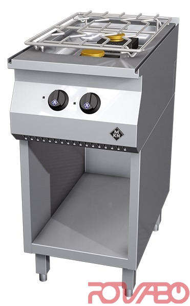 Литые стальные конфорки, плотно посаженные в основании, глубиной 70 мм, что предотвращает подгорание выкипевшей пищи. Требуется газовое соединение DN 15 (½"). 1 конфорка типа C на 3,5 кВт (сзади), 1 конфорка типа D на 5,6 кВт (спереди). Конфорка атмосферного типа, запальная горелка, термоэлектрическое предохранительное устройство, термостат, ручной розжиг. Принадлежности: 1 съёмная решётка из хромоникелевой стали (370x550 мм). Дополнительные принадлежности: 1 дополнительная вставка для 1 конфорки для приготовления на малом огне, 1 решётка из хромоникелевой стали на 1 конфорку (274x370 мм).