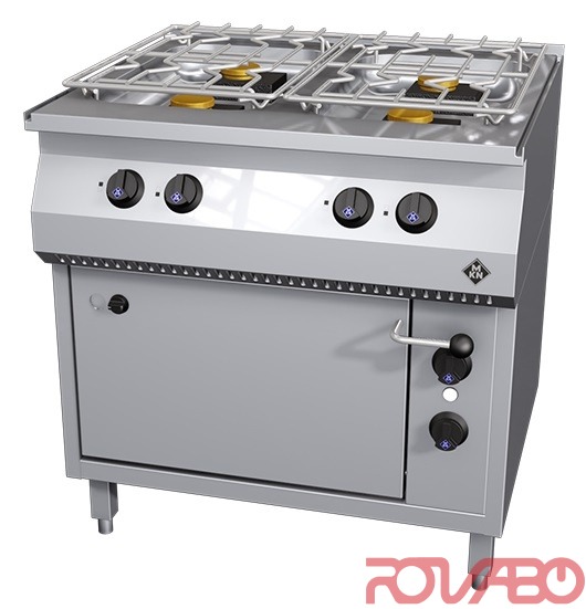 Литые стальные конфорки, плотно посаженные в основании, глубиной 70 мм, что предотвращает подгорание выкипевшей пищи. Требуется газовое соединение DN 15 (½"). 2 конфорки типа C на 3,5 кВт (спереди справа, сзади слева), 2 конфорки типа D на 5,6 кВт (спереди слева, сзади справа). С электрической духовкой 535x520x250 мм, прямая подача тепла сверху, косвенная - снизу, 50-300°C; присоединённая мощность - 4,55 кВт 400 В; электрооборудование: внутренний тэн для тепла сверху, косвенное снизу регулируется термостатом, с контрольным индикатором, переключателем и предохранительным термостатом, подключением к сети, классом защиты IPX4. Принадлежности: 1 гранитный эмалированный противень 1½GN (530x520x40 мм), 1 решётка из хромоникелевой стали 1½ GN; 2 съёмные решётки из хромоникелевой стали (370x550 мм). Дополнительные принадлежности: 1 гранитный эмалированный противень 1½GN (530x520x40 мм), 1 решётка из хромоникелевой стали 1½ GN.