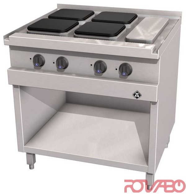 Печь, камера изнутри и дверца печи изготовлены из хромоникелевой стали. 4 конфорки 220х220 мм, по 2,6 кВт каждая. Конфорки с защитным устройством, автоматически снижающим уровень мощности примерно на 50 % в отсутствии эксплуатации. 7-позиционный переключатель для точного терморегулирования. IPX 5. Расстояние между конфорками - менее 35 мм для упрощения перемещения кухонного инвентаря. Эффективная теплоизоляция. На открытом шкафичке. Опция: возможно подключение к системе оптимизации электропитания с беспотенциальным контактом.