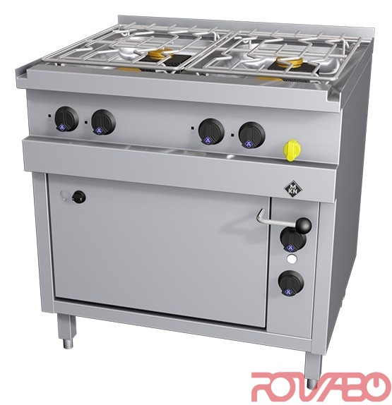 Литые стальные конфорки (h70 мм - предупреждение подгорания выкипающего содержимого) атмосферного типа; термоэлектрическая защита; запальная горелка; ручной поджиг; многопозиционный переключатель, газовый запорный кран. 2 конфорки на 3,5 кВт (сзади) - тип С, 2 на 5,6 кВт - тип D (впереди). Кран для подключения газа DN20 (¾") вмонтирован в лицевую панель. Газ: природный/жидкий (20; 25 / 30; 37; 50 мбар). Испытано Немецкой научно-технической ассоциацией газо-и водоснабжения DVGW. Электрическая духовка размерами 535x520x250 мм: прямая подача тепла сверху (внутренний ТЭН), косвенная – снизу (регулировка термостатом, с индикатором, контрольным выключателем и защитным термостатом, 50-300°C, подключение к силовой сети, класс защиты IPX4). Комплектующие: 1 специальный противень для жарки и выпекания 1½ GN, гранитная эмаль, глубиной 40 мм, решётка хромоникелевая 1½ GN для духовки; 2 выдвижные решётки из хромоникелевой стали (по 370x550 мм).