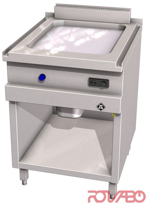 Сварная бесшовная углублённая рабочая поверхность с закруглёнными углами для упрощения очистки. Жарочная поверхность из специальной жаропрочной стали размерами 420x545 мм. Жиросборник примерно на 4 л. Термостатический регулятор температуры. Конфорка атмосферного типа, запальная горелка, термоэлектрическое предохранительное устройство, термостат, пьезоэлектрический розжиг. Газ: природный/жидкий (20; 25/ 30; 37; 50 мбар). Требуется газовое соединение DN 15 (½").