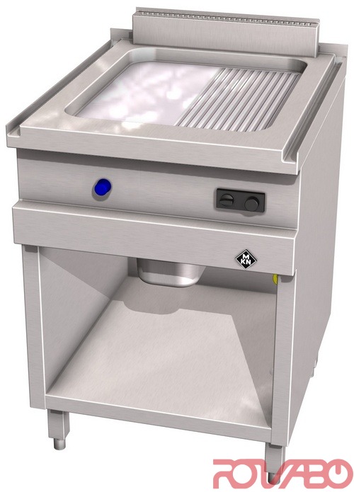 Сварная бесшовная углублённая рабочая полурифлёная поверхность с закруглёнными углами для упрощения очистки. Жарочная поверхность из специальной жаропрочной стали размерами 420x545 мм. Жиросборник примерно на 4 л. Термостатический регулятор температуры. Конфорка атмосферного типа, запальная горелка, термоэлектрическое предохранительное устройство, термостат, пьезоэлектрический розжиг. Газ: природный/жидкий (20; 25/ 30; 37; 50 мбар). Требуется газовое соединение DN 15 (½").