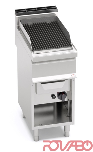 Рабочая поверхность и фронтальные панели из нержавеющей стали AISI304. 7 738 ккал/ч. Штампованная ёмкость для масла. Регулировка мощности (мин/макс). Запальная горелка, предохранительный клапан, оснащённый термопарой. Пьезоэлектрический поджиг с защитой из силикона. Горелки и чашечки из нержавеющей стали 304. Крупная жарочная поверхность со съёмной чугунной решёткой. Съёмные компоненты для упрощения обслуживания и очистки. Крупная съёмная ёмкость из нержавеющей стали для сбора кулинарного жира и воды.
