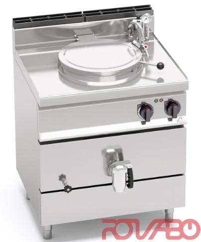 Рабочая поверхность и фронтальные панели из нержавеющей стали AISI304. Варочная ёмкость из нержавеющей стали AISI304 толщиной 15/10 (1,5 мм), дно из нержавеющей стали AISI316 толщиной 20/10 (2 мм). Рубашка с дном и стенками из нержавеющей стали AISI304, дно толщиной 20/10, стенки - 15/10. Косвенный нагрев паром низкого давления (0,5 бар), образующимся в рубашке за счёт нагревательных элементов, оснащённых предохранительным термостатом. Краны подачи горячей и холодной воды, расположенные на рабочей поверхности, с подвижным носиком для наполнения и мойки ёмкости и рубашки. Сливной кран 1 1⁄2’’ из хромированной латуни с ненагревающейся ручкой. Механический манометр с индикатором давления в рубашке. 3-позиционный переключатель мощности. Индивидуальное управление терморегулированием. Индикатор питания и температуры. Регулируемые ножки.