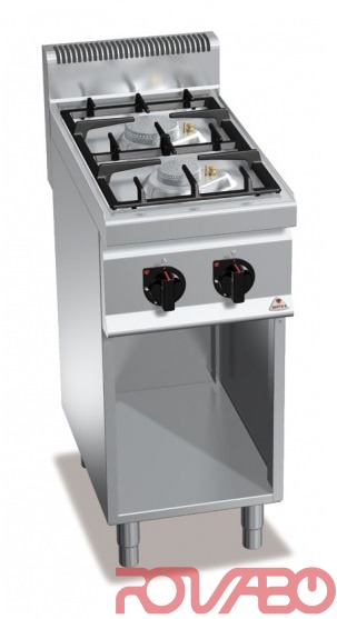Рабочая поверхность и фронтальные панели изготовлены из нержавеющей стали AISI 304. Горелки чугунные ø120, 90 мм, активируются посредством крана, герметично закреплены на цельнотянутой рабочей поверхности. С защитной термопарой и запальной горелкой с латунной головкой - простая очистка, обслуживание. Регулируемые ножки.