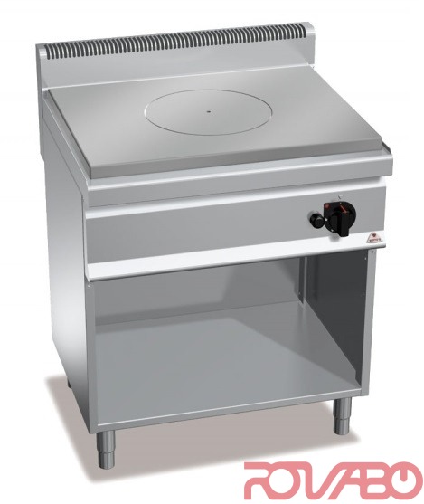 Рабочая поверхность и фронтальные панели из нержавеющей стали AISI304. Габаритная высокопрочная плита из толстого чугуна с дифференцированным распределением тепла по зонам: максимальная температура в центре и убывающая по направлению к краям. Центральная горелка на 5 кВт с оптимизированным горением, активируется посредством крана с предохранительным клапаном, оснащённым термопарой с защищённой запальной горелкой. Пьезоэлектрический поджиг с защитой из силикона в камере сгорания, покрытой вермикулитом; высокоизоляционный материал. Регулируемые ножки.