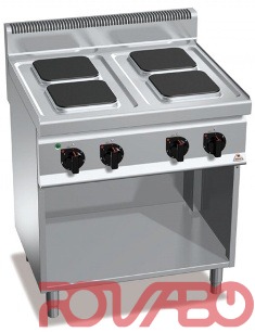 Рабочая поверхность, фронтальные панели из нержавеющей стали AISI304. Чугунные конфорки. Цельноштампованная герметичная поверхность. Конфорки с предохранительным термостатом и 6-позиционным переключателем, активирующим 6 различных концентрических зон мощности. Индикаторы напряжения и питания. Регулируемые ножки.