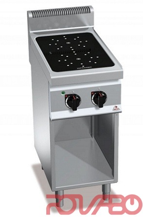 Рабочая поверхность и фронтальные панели из нержавеющей стали AISI304. Стеклокерамическая поверхность толщиной 6 мм. Нагревательные элементы, достигающие высокой температуры (500°C) при подогреве варочной поверхности за счёт излучения. Зоны, маркированные методом сериграфии, позволяют правильно расположить посуду. После выключения каждой отдельной зоны световой индикатор указывает на остаточное тепло до 60°C для обеспечения безопасных условий работы оператора. Ручка дверцы из высокопрочной стали AISI304 толщиной 20/10 (2 мм). Регулируемые ножки.