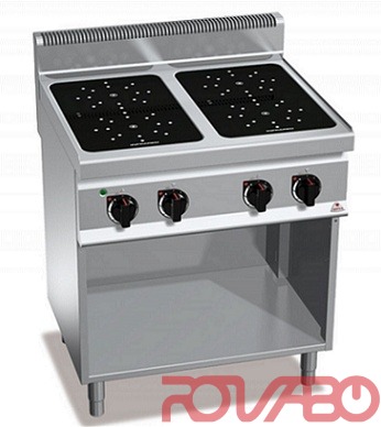 Рабочая поверхность и фронтальные панели из нержавеющей стали AISI304. Стеклокерамическая поверхность толщиной 6 мм. Нагревательные элементы, достигающие высокой температуры (500°C) при подогреве варочной поверхности за счёт излучения. Зоны, маркированные методом сериграфии, позволяют правильно расположить посуду. После выключения каждой отдельной зоны световой индикатор указывает на остаточное тепло до 60°C для обеспечения безопасных условий работы оператора. Ручка дверцы из высокопрочной стали AISI304 толщиной 20/10 (2 мм). Регулируемые ножки.