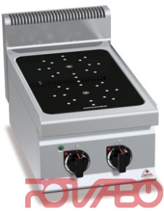 Рабочая поверхность и фронтальные панели из нержавеющей стали AISI304. Стеклокерамическая поверхность толщиной 6 мм. Нагревательные элементы, достигающие высокой температуры (500°C) при подогреве варочной поверхности за счёт излучения. Зоны, маркированные методом сериграфии, позволяют правильно расположить посуду. После выключения каждой отдельной зоны световой индикатор указывает на остаточное тепло до 60°C для обеспечения безопасных условий работы оператора. Ручка дверцы из высокопрочной стали AISI304 толщиной 20/10 (2 мм).