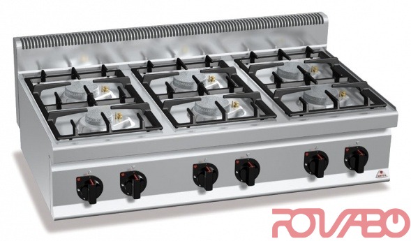 Рабочая поверхность и фронтальные панели из нержавеющей стали AISI 304. Чугунные горелки ø120, 90 мм, активируются посредством крана, герметично закреплены на цельнотянутой рабочей поверхности. Защитная термопара с запальной горелкой с латунной головкой - простая очистка, обслуживание.