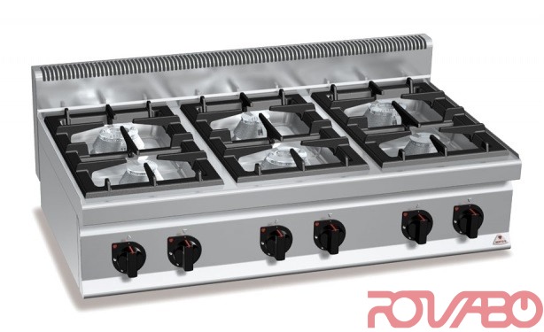 Рабочая поверхность и лицевые панели из нержавеющей стали AISI 304. Высокомощные чугунные никелированные с пожизненной гарантией, с одинарной или двойной короной, активируются краном-клапаном с защитной термопарой и контрольным индикатором. Чугунные решётки. Чаши полностью съёмные для упрощения и повышения эффективности обслуживания и очистки. 27 090/36 120 ккал/ч. Стандартная комплектация: 3 чаши горелок из нержавеющей стали. По запросу: решётки из нержавеющей стали.