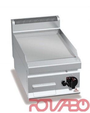Рабочая поверхность и фронтальные панели из нержавеющей стали AISI304. 5 932 ккал/ч. Трубчатые горелки с самостабилизирующимся пламенем, расположенные на большой площади для обеспечения большей однородности распределения тепла. Регулировка мощности ручкой непрерывного действия. Запальная горелка и предохранительный клапан, оснащённый термопарой. Пьезоэлектрический поджиг с защитой из силикона. Максимальная температура - более 300°C. Гладкая жарочная поверхность из сатинированной стали на всю рабочую поверхность, с брызгозащитным бортиком. Жарочная поверхность под небольшим наклоном с крупным сливным отверстием для обеспечения слива в соответствующий герметичный контейнер для сбора жидкости.