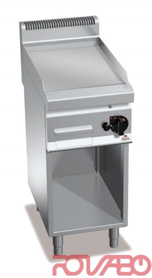 Рабочая поверхность и фронтальные панели из нержавеющей стали AISI304. 5 932 ккал/ч. Трубчатые горелки с самостабилизирующимся пламенем, расположенные на большой площади для обеспечения большей однородности распределения тепла. Регулировка мощности ручкой непрерывного действия. Запальная горелка и предохранительный клапан, оснащённый термопарой. Пьезоэлектрический поджиг с защитой из силикона. Максимальная температура - более 300°C. Гладкая жарочная поверхность из сатинированной стали на всю рабочую поверхность, с брызгозащитным бортиком. Жарочная поверхность под небольшим наклоном с крупным сливным отверстием для обеспечения слива в соответствующий герметичный контейнер для сбора жидкости. Регулируемые ножки.