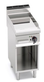 Рабочая поверхность и фронтальные панели из нержавеющей стали AISI 304. ТЭНы из сплава инколой расположены под жарочной поверхностью. Термостат, предохранительный термостат с ручным перезапуском. Индикатор питания и температуры. Очень толстая гладкая рабочая поверхность с брызгозащитным бортиком. Двухкомпонентная жарочная поверхность из стального листа для оптимизации однородной готовки с верхним покрытием из шлифованной нержавеющей стали AISI 316 для упрощения очистки и минимизации излучения для большего удобства оператора. Имеет небольшой уклон, крупное сливное отверстие с выводом в поддон. Подходит, в частности, для деликатного приготовления. Регулируемые ножки. По запросу: дверца с ручкой толщиной 20/10 - для моделей со шкафчиком; 220 - 240В 3~; тефлоновая пробка.