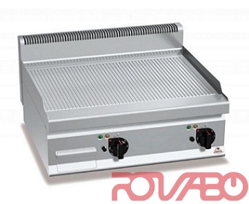 Рабочая поверхность и фронтальные панели из нержавеющей стали AISI304. Нагревательные элементы из сплава инколой расположены под жарочной поверхностью. Термостатический контроль и предохранительный термостат с функцией ручного перезапуска. Регулировка температуры от 50 до 270°C. Индикатор питания и температуры. Рифлёная жарочная поверхность из сатинированной стали с брызгозащитным бортиком, занимающая всю рабочую поверхность, под небольшим наклоном с крупным сливным отверстием для обеспечения слива в соответствующий контейнер для сбора жидкости. Каждая зона (2) с отдельным управлением для обеспечения независимого и идеального терморегулирования. Регулируемые ножки.