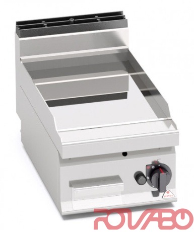 Рабочая поверхность и лицевые панели выполнены из нержавеющей стали AISI304. Гладкая жарочная поверхность сверхвысокой толщины с невыступающим брызгозащитным элементом; двукомпонентная жарочная поверхность, состоящая из стального листа для оптимизации равномерности нагрева, и верхнего покрытия из полированной нержавеющей стали AISI 316, что упрощает очистку, с низким уровнем теплового излучения для обеспечения комфортных условий работы оператора. 5 932 ккал/ч. Трубчатые горелки с самостабилизирующимся пламенем и большой удельной поверхностью для обеспечения более равномерного распределения тепла. Регулировка мощности ручкой с термостатом. Запальник и защитный клапан с термопарой. Пьезорозжиг, силиконовый уплотнитель. Максимально допустимая температура в диапазоне 280°C. Незначительно скошенная жарочная поверхность с крупным отверстием для слива с герметичным жиросборником. Идеально подходят для готовки в щадящем режиме.