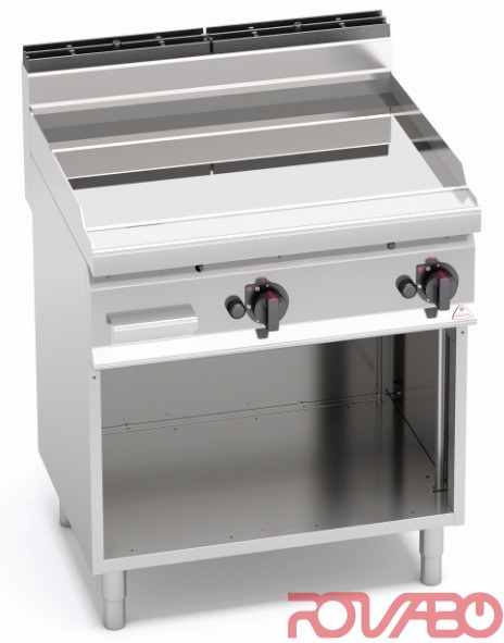 Рабочая поверхность и фронтальные панели из нержавеющей стали AISI 304. 11 868 ккал/ч. Трубчатые горелки с самостабилизирующимся пламенем и большой удельной поверхностью для обеспечения более равномерного распределения тепла. Пьезоэлектрический поджиг с защитой из силикона. Регулировка мощности ручкой термостата. Запальная горелка и предохранительный клапан, оснащённый термопарой. Очень толстая гладкая рабочая поверхность с брызгозащитным бортиком. Двухкомпонентная жарочная поверхность из стального листа для оптимизации однородной готовки с верхним покрытием из шлифованной нержавеющей стали AISI 316 для упрощения очистки и минимизации излучения для большего удобства оператора. Две зоны приготовления с индивидуальным управлением для независимого оптимального регулирования температуры. Подходит, в частности, для деликатной готовки. Жарочная поверхность имеет небольшой уклон, крупное сливное отверстие для вывода жидкостей в соответствующий герметичный контейнер для отходов. Регулируемые ножки. По запросу: 2 дверцы с ручкой толщиной 20/10 - для моделей со шкафчиком; тефлоновая пробка.