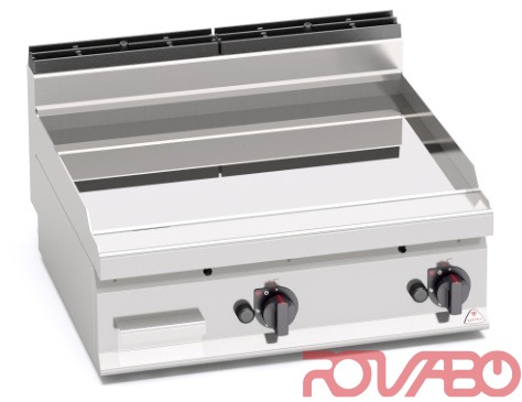 Рабочая поверхность и фронтальные панели из нержавеющей стали AISI 304. 11 868 ккал/ч. Трубчатые горелки с самостабилизирующимся пламенем и большой удельной поверхностью для обеспечения более равномерного распределения тепла. Пьезоэлектрический поджиг с защитой из силикона. Регулировка мощности ручкой термостата. Запальная горелка и предохранительный клапан, оснащённый термопарой. Очень толстая гладкая рабочая поверхность с брызгозащитным бортиком. Двухкомпонентная жарочная поверхность из стального листа для оптимизации однородной готовки с верхним покрытием из шлифованной нержавеющей стали AISI 316 для упрощения очистки и минимизации излучения для большего удобства оператора. Две зоны приготовления с индивидуальным управлением для независимого оптимального регулирования температуры. Подходит, в частности, для деликатной готовки. Жарочная поверхность имеет небольшой уклон, крупное сливное отверстие для вывода жидкостей в соответствующий герметичный контейнер для отходов. Регулируемые ножки. По запросу: 2 дверцы с ручкой толщиной 20/10 - для моделей со шкафчиком; тефлоновая пробка.