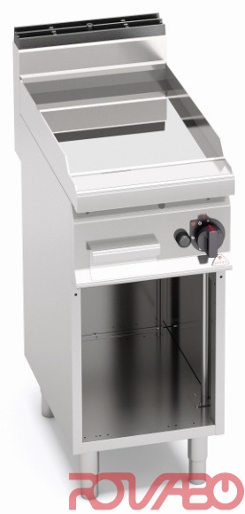 Рабочая поверхность и фронтальные панели из нержавеющей стали AISI 304. 5 934 ккал/ч. Трубчатые горелки с самостабилизирующимся пламенем и большой удельной поверхностью для обеспечения более равномерного распределения тепла. Пьезоэлектрический поджиг с защитой из силикона. Регулировка мощности ручкой термостата. Запальная горелка и предохранительный клапан, оснащённый термопарой. Очень толстая гладкая рабочая поверхность с брызгозащитным бортиком. Двухкомпонентная жарочная поверхность из стального листа для оптимизации однородной готовки с верхним покрытием из шлифованной нержавеющей стали AISI 316 для упрощения очистки и минимизации излучения для большего удобства оператора. Подходит, в частности, для деликатной готовки. Жарочная поверхность имеет небольшой уклон, крупное сливное отверстие с выводом в поддон. Регулируемые ножки. По запросу: дверца с ручкой толщиной 20/10 - для моделей со шкафчиком; тефлоновая пробка.