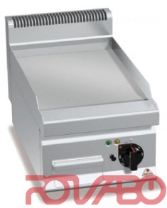 Рабочая поверхность и фронтальные панели из нержавеющей стали AISI304. Нагревательные элементы из сплава инколой расположены под жарочной поверхностью. Термостатический контроль и предохранительный термостат с функцией ручного перезапуска. Регулировка температуры от 50 до 270°C. Индикатор питания и температуры. Гладкая жарочная поверхность из сатинированной стали с брызгозащитным бортиком, занимающая всю рабочую поверхность, под небольшим наклоном с крупным сливным отверстием для обеспечения слива в соответствующий герметичный контейнер для сбора жидкости.