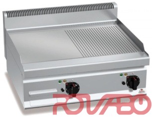 Рабочая поверхность и фронтальные панели из нержавеющей стали AISI304. Нагревательные элементы из сплава инколой расположены под жарочной поверхностью. Термостатический контроль и предохранительный термостат с функцией ручного перезапуска. Регулировка температуры от 50 до 270°C. Индикатор питания и температуры. Полурифлёная жарочная поверхность из сатинированной стали с брызгозащитным бортиком, занимающая всю рабочую поверхность, под небольшим наклоном с крупным сливным отверстием для обеспечения слива в соответствующий контейнер для сбора жидкости. Каждая зона (2) с отдельным управлением для обеспечения независимого и идеального терморегулирования.