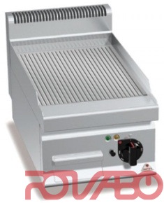 Рабочая поверхность и фронтальные панели из нержавеющей стали AISI304. Нагревательные элементы из сплава инколой расположены под жарочной поверхностью. Термостатический контроль и предохранительный термостат с функцией ручного перезапуска. Регулировка температуры от 50 до 270°C. Индикатор питания и температуры. Рифлёная жарочная поверхность из сатинированной стали с брызгозащитным бортиком, занимающая всю рабочую поверхность, под небольшим наклоном с крупным сливным отверстием для обеспечения слива в соответствующий контейнер для сбора жидкости.