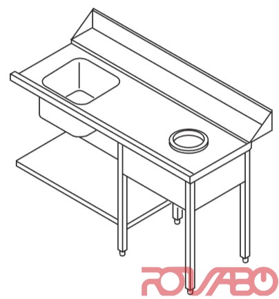Для посудомоечных машин купольного типа. Стол право- или левостороннего исполнения с раковиной 400x400xh200 мм с брызгозащитным элементом, нижней полкой и отверстием для отходов.