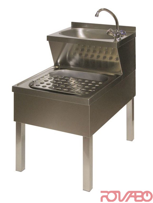 Hand-wash basin above. Water trap basin perforated underneath. Free-standing with 1 hand-wash and water trap basin. Completely made of stainless steel. With edge, water tap and stand pipe.