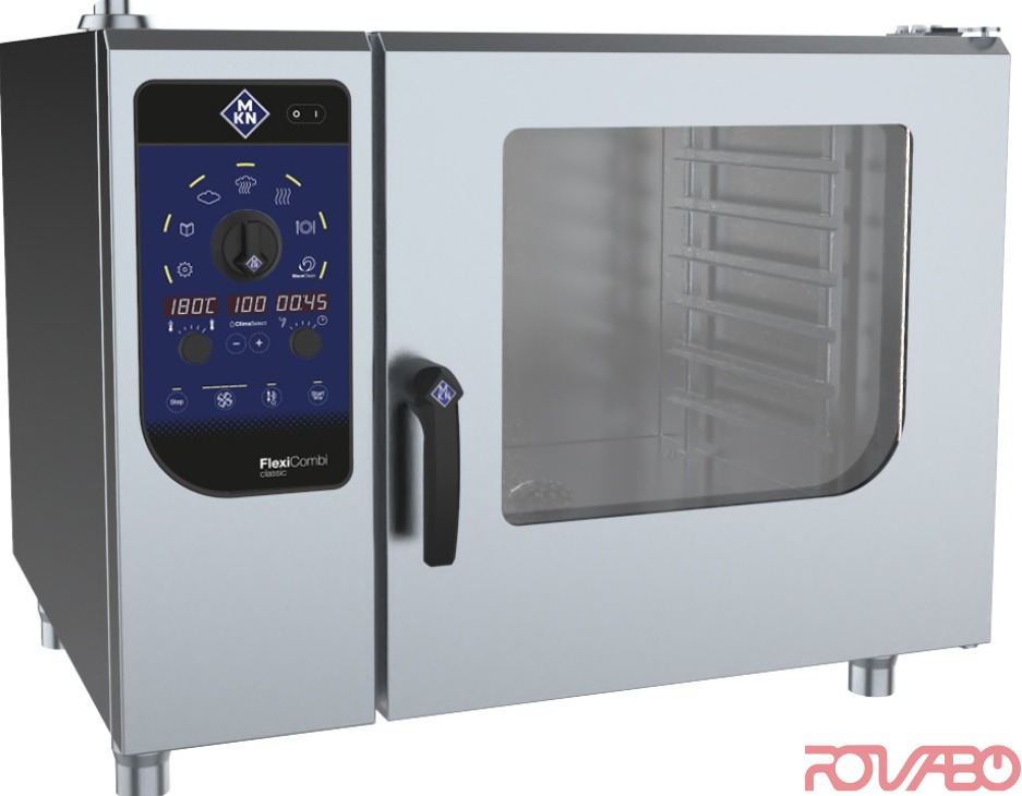 Housing of corrosion-resistant chromium-nickel steel. Capacity: 6xGN2/1; or 6 FlexiRack® (530x570 mm) due to which MKN oven is 50% more added value as compared to MKN GN1/1 combisteamers. Manual cooking: 6 types (soft steaming, steaming, express steaming, convection, combisteaming, regeneration). Operating modes: convection 30–300° C, steaming 30–130°C (incl. soft & express steaming), combisteaming 30–250°C. 100 cooking processes can be saved in up to 6 steps. Pros: auto-reverse fan operation - 5 fan speeds; PHIeco DynaSteam2 steam control for consistent, ideal food quality; multipoint core temperature probe – option (single-point core temperature probe as standard); ClimaSelect – climate control in 25 % steps; heat exchanger; hygienic cooking chamber door with closed triple glazing and integrated led lighting; WaveClean® automatic cleaning system (cartridge) - option; integrated hand shower; integrated grease separation system without filter; USB interface; height adjustable stainless steel appliance feet. Special functions: optional IPX 6 protection against strong jets of water. Additional features: Ready2Cook preheating, cooling down, preparing ideal climate without opening the doors.