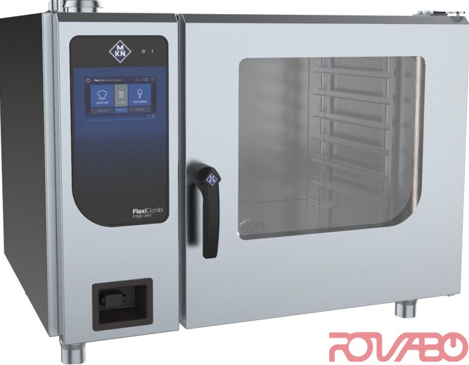 Housing of corrosion-resistant chromium-nickel steel. New lighting concept (LED door and rear lighting) and faster operating system - the new MagicPilot® system with faster hardware, new feature 'MultiCook' – intelligent cooking time control with visual representation of products and automatic time setting, new display design (one product family - one operating system - one design), WLAN (OPC UA and REST API interface, software updates using cloud or app) and connection to MKN ConnectedKitchen®. Touch&Slide operating concept, capacitive touch system, hardened glass. Capacity: 6xGN2/1; or 6 FlexiRack® (530x570 mm) due to which MKN oven is 50% more added value as compared to MKN GN1/1 combisteamers. autoChef - more than 250 automatic cooking processes (10 categories); more than 350 cooking processes can be saved in up to 20 steps. Manual cooking: 12 types (soft steaming, steaming, express steaming, convection, combisteaming, perfection, LT low temperature, Delta-T, humidification, baking, rest function, sous vide cooking). Operating modes: convection 30–250°C, steaming 30–130°C (incl. soft & express steaming), combisteaming 30–250°C. Pros: auto-reverse fan operation - 5 fan speeds; PHIeco DynaSteam2 steam control for consistent, ideal food quality; SES – Steam Exhaust System; multipoint core temperature probe; RackControl – multiple timers; ClimaSelect plus – climate control in 10 % steps; heat exchanger; cooking chamber door with insulated triple glazing; WaveClean® automatic cleaning system (cartridge); integrated hand shower; integrated grease separation system without filter; USB interface; height adjustable stainless steel appliance feet; halogen cooking chamber lighting. Special functions: PerfectHOLD with SmartCoolDown; Barcode scanning without scanner (option); CombiDoctor – self-diagnosis programme; Time2Serve; VideoAssist – the virtual chef; Favourites – directly accessible in Favourites programme; ChefsHelp – information steps as instructions/help for the user; QualityControl – automatic quantity detection. Additional features: option - SmokeInside – integrated smoking function (for 6.x and 10.x); Ready2Cook preheating, cooling down, preparing ideal climate without opening the doors; RackControl 2 – multiple timers; Digital fan forced burner technology for gas appliances.