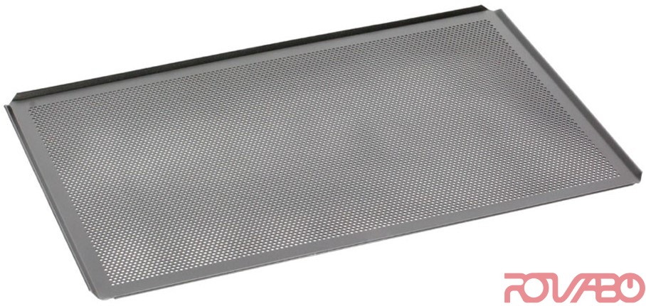 Perforated baking tray with with special non-stick coating suitable for e.g. croissants, pretzels, rolls, baguettes.