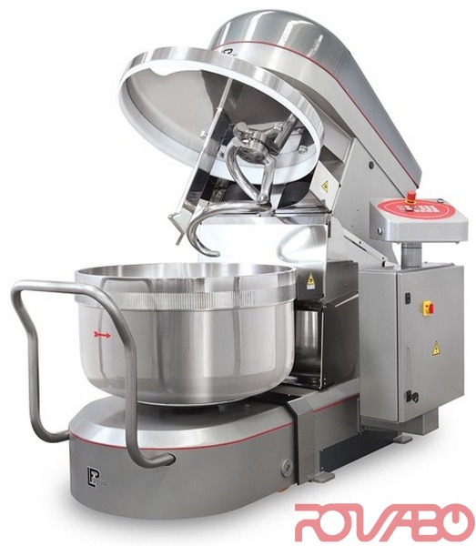 Spiral mixer with removable bowl. Bowl locking through hydraulic hook. Fitted with three motors: one for spiral tool, one for bowl and one for hydraulic unit. Two speeds on spiral tool. One speed on bowl with possibility of reverse bowl rotation in 1st speed. Closed bowl protection in stainless steel and polyethylene with front hole. Electrical box and control panel placed on the right side front the machine (possibility to have them on the left side upon request). Control panel at choice between: two electro-mechanical timers or electronic control panel fitted with bypass selector. This line is conceived for soft dough mixtures with an hydration greater than 55% with European flour and for a semi-industrial use (3/4 cycles per hour, 2 shifts per day).
