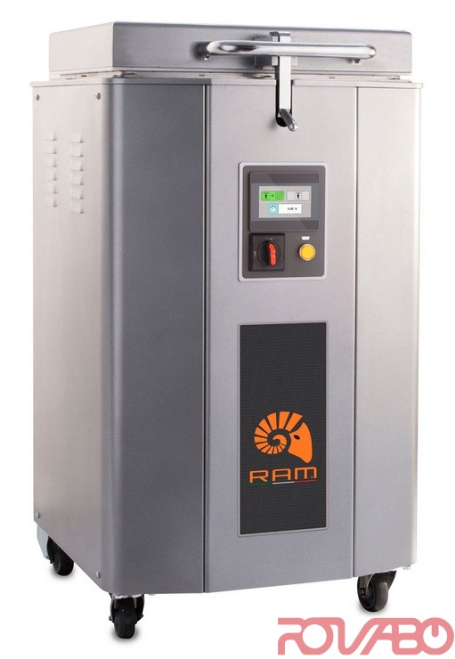 Machine suitable to divide dough for bakeries, pastry workshop and pizzerias. Steel stove painted structure. Reduced dimensions for an easy positioning inside the workshop. Stainless steel AISI 304 bowl and knives. Complete hydraulic working with big tank and double sealing between tank and hydraulic unit. High quality food material stamps not subject to expansion. Stainless steel anti-corrosion protection above to the stamping plate. Display for pressing time adjustment. Automatic switching off at the end of the cycle for a bigger safety and energy saving. Stainless steel collecting crumbs tray easy to reach thanks to lateral covers assembled on hinges. Knives cleaning push-button. On castors made of soft rubber with brake for greater stability and noiselessness. Working cycle: automatic pressing, cutting and lid opening.