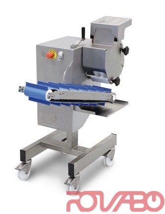 Connected in line to a hamburger forming machine (which produces cylindrically-shaped portions), this machine changes them into spherical formats (meatballs). For ready meals, refectories, communities, food processing centres, small scale industries, etc. Stainless steel structure. Outfeed conveyor belt, the height of which can be adjusted, can be removed for cleaning (it receives the meatballs and places them on a counter or other equipment for the subsequent processing cycles). The roller and counter-roller units (halfmoon-shaped) can be removed without tools for the cleaning and size changeover operations. On request: different meatball formats can be provided as well as systems for connecting to other brands of hamburger forming machines (subject to approval by our Technical Dept.).