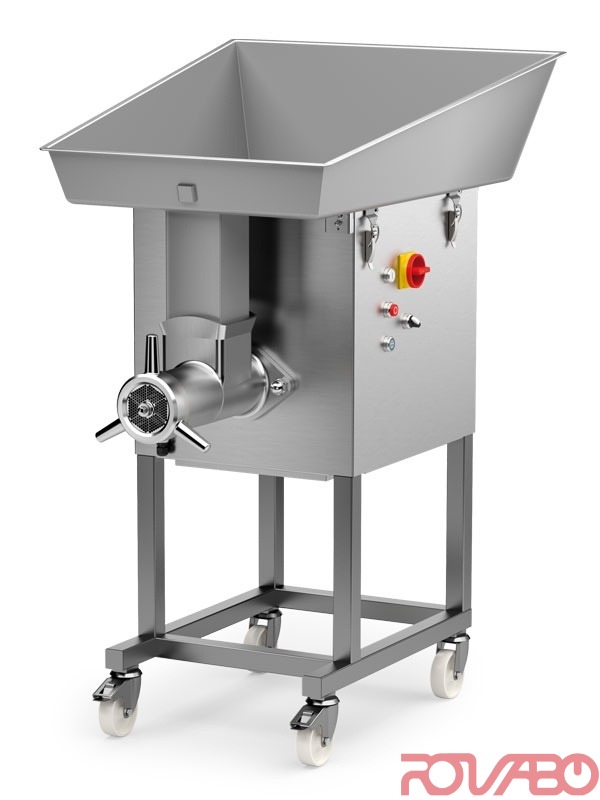 Casing in AISI 304 stainless steel, brake wheels floor standing. Cutting system and hopper easily and completely removable for cleaning purposes. Standard equipment: kit for connecting Patty former or foot pedal (not included). The mincer can be equipped either with a back (standard ), flat 630x930x125 mm or sideways lifted 845x925x110/250 mm hopper. Enterprise: 1 plate and one self-sharpening knife in stainless steel. Output: 1500 kg/h.