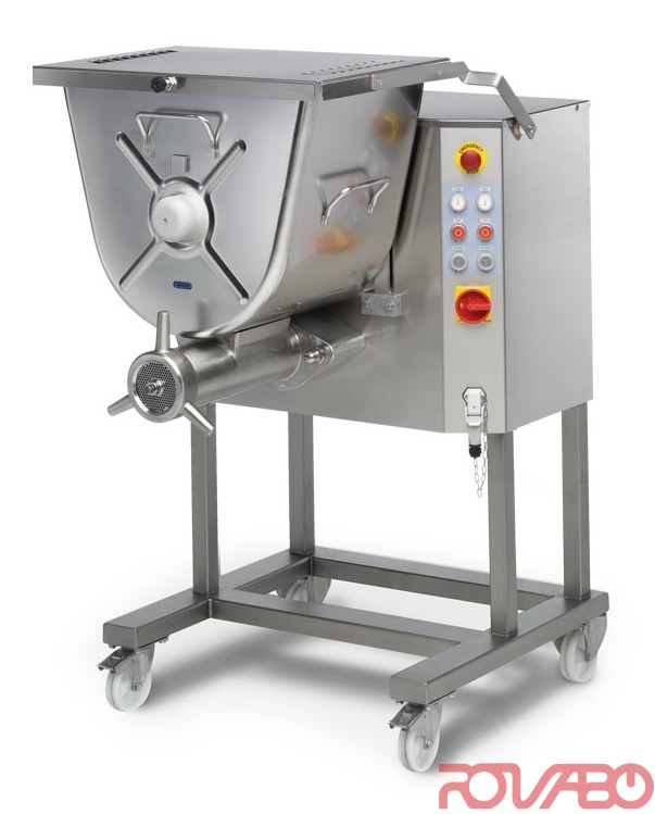 32/98 external head for mass production in AISI 304 stainless steel, easily disassembling: Unger S5: ø 98, 3 plates, 2 self-sharpening knives and two rings. Casing, mincing assembly, blades and pan in AISI 304 stainless steel. Two independent motors with reverse. Silent and maintenance-free reduction gear drive. Mincing unit, pan and cover safeguarded by safety microswitches. Output: 1200 kg/h. Pan capacity: 84 l.