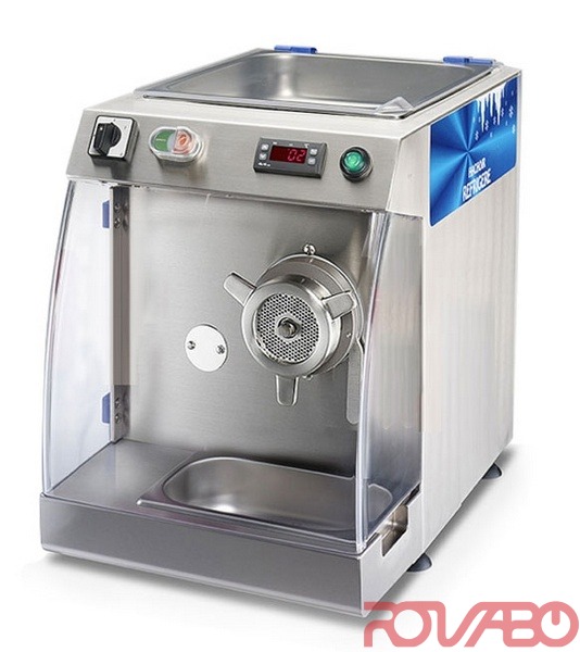 Stainless steel outer body. Stainless steel hopper. Stainless steel frame and feeding pan. Stainless steel internal head, worm and clamp wheel. Enterprise version: stainless steel plate and knife (self-sharpening). Transparent Plexiglas cover as standard. Start, Stop and Reverse with NVR system at low tension. Independent mincing and refrigeration systems. Hermetic and silent compressor. Electronic thermostat with an efficient temperature management. Optimal running temperature 1°C. R134A Refrigerant gas with null environmental impact. Chilled hopper on 5 sides. Chilled display window and protection for mouth. Output: 300 kg/h. Output of hamburger: ~ 500 units/h. On request: Special voltages, 60 Hz, stainless table with wheels.