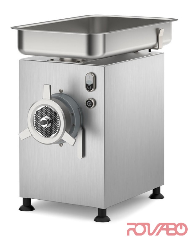 Aisi 304 stainless steel removable feed pan. Barrel, worm, locking ring made of AISI 304 stainless steel. Enterprise version: 1 plate and 1 self-sharpening knife in stainless steel. Start, stop and reverse. For retail, butchers, supermarkets and collective catering. Output: 500 kg. On request: special voltages, 60 Hz.