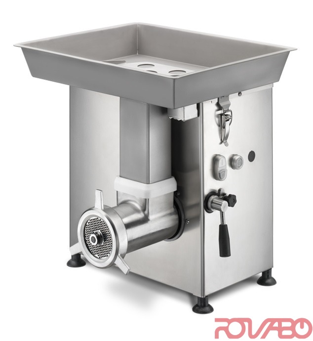 Larger barrel and tube feeder, 50% to 80% extra capacity as compared. Excellent mincing performance, thanks to a special design and the very small tolerance between worm and barrel. Easy to fit, sturdy head fixing. AISI 304 stainless steel casing and removable feed pan. Easy and safe to clean; the head, the feed pan, the tube and the mincing group can be removed to be thoroughly washed, without any risk of damaging the machine. Start, emergency stop and reserve push-button commands are fitted with low tension (24V) NVR. Electrical parts are contained in an IP 56 rated water-tight box. Enterprise cutting system: 1 plate and 1 knife made of stainless steel. Output: 750 kg/h. On request: special voltages, 60 Hz and stainless steel table with wheels.
