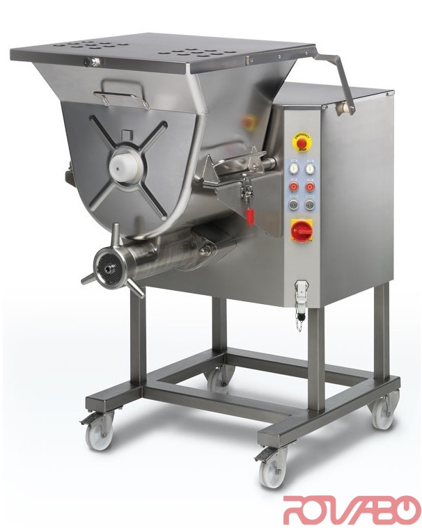 Equipped with mixer, trolley elevator, stainless steel body, cover and stainless steel external 32 head - start/stop/reverse. Oil bath direct gear drive. Version equipped with Enterprise cutting system: (nr. 1 stainless steel pate and nr. 1 stainless steel knife). Output: 1500 kg/h. Power mixer: 1500 W. Pan capacity: 117 l.