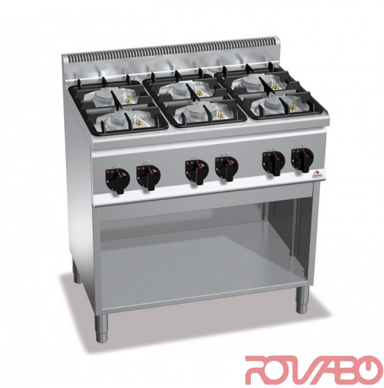Darbo ir priekiniai paviršiai iš nerūdijančio plieno AISI 304. Šeši ketaus ø90, 120 mm degikliai, iš kurių trys - po 6 kW ir trys - po 3,5 kW. Termoporos saugos sistema, apsauganti nuo dujų nutekėjimo. Užapvalinti kraštai. Apsauginis bortelis nuo taškymosi. Su atvira spintele. Reguliuojamos kojelės.