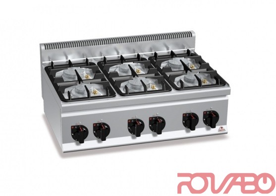 Darbo ir priekiniai paviršiai iš nerūdijančio plieno AISI 304. Šeši ketaus ø90, 120 mm degikliai, iš kurių trys - po 6 kW ir trys - po 3,5 kW. Termoporos saugos sistema, apsauganti nuo dujų nutekėjimo. Užapvalinti kraštai. Apsauginis bortelis nuo taškymosi. Statoma ant stalo.