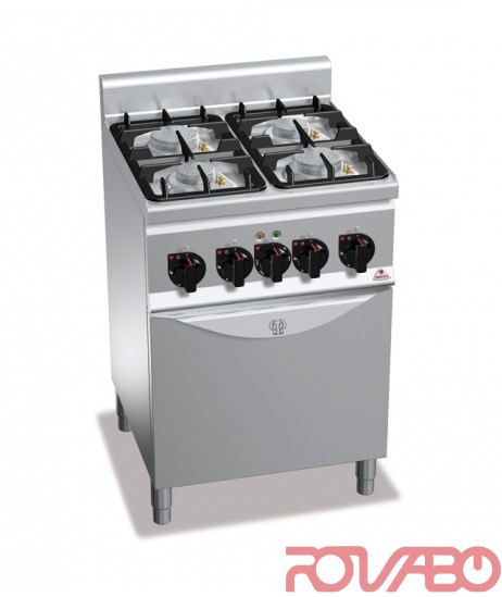 Darbo ir priekiniai paviršiai iš nerūdijančio plieno AISI 304. Ketaus ø90, 120 mm degikliai, iš kurių du - po 6 kW ir du - po 3,5kW. Termoporos saugos sistema, apsauganti nuo dujų nutekėjimo. Užapvalinti kraštai. Apsauginis bortelis nuo taškymosi. Reguliuojamos kojelės. Konvekcinė orkaitė iš termoizoliacinio nerūdijančio plieno, su trijų lygių kreipiančiosiomis (GN 1/1) ir riebalų surinkimo sistema, galingumas - 3,5 kW. Orkaitės temperatūra reguliuojama nuo 50 - 300º С. Komplekte 1 grotelės GN1/1.