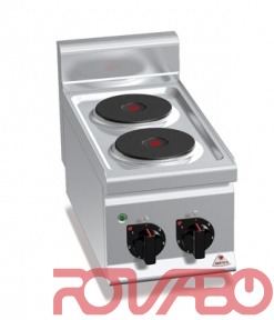 Darbo ir priekiniai paviršiai iš nerūdijančio plieno AISI 304. Apvalios 2 ketaus kaitlentės Ø 180 mm, kiekviena po 2 kW, su kaitinimo elementais, kurie hermetiškai įlituoti. 6 perjungimo padėtys. Apsaugos termostatas. Įjungimo ir darbo būvio davikliai. Užapvalinti kraštai. Bortelis nuo taškymosi. Statoma ant stalo.
